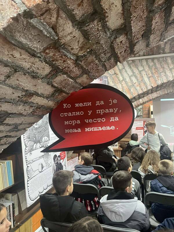 У оквиру обележавања Месеца књиге, ученици петог разреда посетили су Народну библиотеку "Радислав Никчевић" и упознали се са животом и радом Душана Радовића кроз изложбу" Био једном један лаф, Душан Радовић". Стихови, афоризми и занимљивости из живота овог великана, као и његови цитати били су врло едукативни и помогли су ученицима да боље сагледају његов лик и дело. Посету су реализовали наставница српског језика, Весна Стојановић и библиотекар школе, Драгана Станковић.