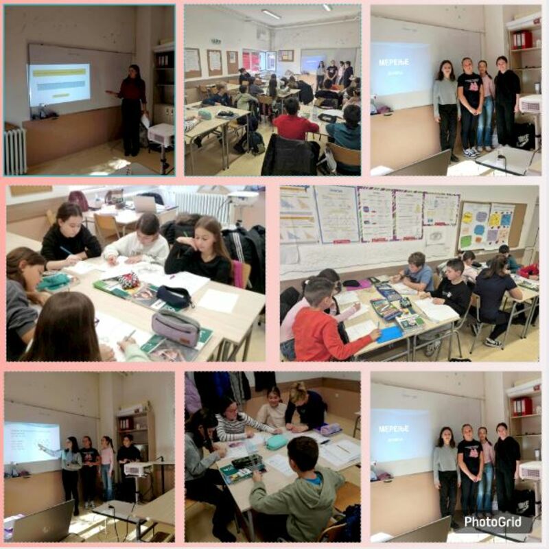 У четвртак, 13. новембра 2025. године, у одељењу 5/5 одржан је сараднички час из математике и физике. Ученици су на овом часу повезали знања из оба предмета кроз тему „Дужина дужи“. Циљ часа био је да ученици разумеју дужину као геометријски облик и као физичку величину која се мери и изражава различитим јединицама. У уводном делу, ученици шестог разреда, одељења 6/1 и 6/2, заједно са наставницом физике, подсетили су ученике петог разреда на појам дужи, крајње тачке и начин мерења помоћу лењира. Такође су објаснили значење физичке величине дужине, основну мерну јединицу – метар, као и односе између јединица (мм, цм, дм, м, км). Након тога, ученици петог разреда су мерили дужине различитих геометријских облика, записивали резултате и претварали јединице, уз помоћ ученика шестог разреда. Час је био осмишљен као интерактиван и истраживачки, са нагласком на развијање радозналости и сарадње код ученика. Ученици су, кроз овај процес, уочили везу између математичког и физичког знања и схватили како се ова два подручја наука међусобно допуњују. На крају часа, наставници су заједно са ученицима сумирали закључке о значају тачног мерења и разумевања дужине, како у науци, тако и у свакодневном животу. Час су реализовале Марија Ристић, наставница математике, и Оливера Јовановић, наставница физике. Часу је присуствовала помоћница директора, Маријана Цветковић.