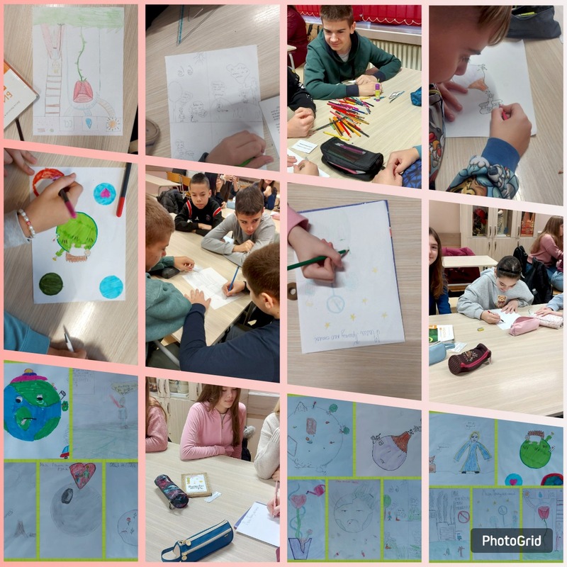 У оквиру наставне јединице „Мали принц – одговорност човека према живом свету“, реализоване на часу биологије, ученици 7. разреда учествовали су у истраживању еколошких тема и њихове повезаности са садржајима пројекта „Мали принц – од планете до планете, од предмета до предмета“. Кроз групни рад, анализу примера из природе и дискусију, ученици су препознавали значај повезаности живих бића, утицај човека на животну средину и различите облике понашања животиња. Посебну пажњу посветили су опасностима које прете нашој планети, као и могућностима да је заштите сопственим свакодневним поступцима. Своје закључке и идеје представили су креативним илустрацијама. Наставница: Љиљана Глођовић Пантић