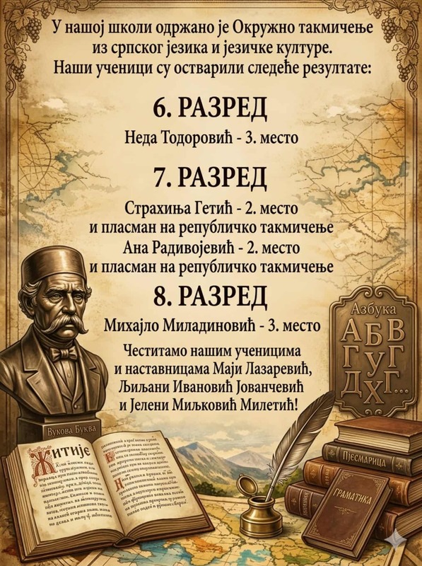 У нашој школи у недељу, 22. марта 2026. године одржано је Окружно такмичење из српског језика и језичке културе. Наши ученици су остварили следеће резултате: 6. РАЗРЕД Неда Тодоровић – 3. место 7. РАЗРЕД Страхиња Гетић – 2. место и пласман на републичко такмичење Ана Радивојевић – 2. место и пласман на републичко такмичење 8. РАЗРЕД Михајло Миладиновић – 3. место Честитамо нашим ученицима и наставницама Маји Лазаревић, Љиљани Ивановић Јованчевић и Јелени Миљковић Милетић!