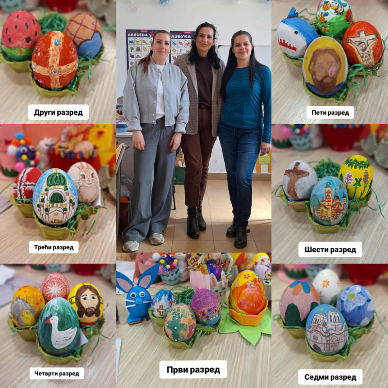 У нашој школи одржан је избор за најлепше ускршње јаје, који је окупио велики број креативних ученика. Жири, у саставу директорке Сање Прибаковић, наставнице ликовне културе Александре Петровић и учитељице Јелене Вулетић, имао је тежак задатак да изабере најбоље радове. Најуспешнији ученици су награђени и представљаће школу на градском такмичењу. Први разред: 1. место: Димитрије Стојадиновић (1/2) и Ирис Петковић (1/3) 2. место: Арсеније Живковић (1/1) и Ђурђа Стојиљковић (1/4) 3. место: Константин Павловић Најлепша декорација: Василије Миљковић (1/2) Други разред: 1. место: Алиса Станишић (2/2) 2. место: Теодора Стошић (2/2) 3. место: Викторија Денић (2/1) Трећи разред: 1. место: Богдан Ђурђевић (3/3) 2. место: Ђорђе Станишић (3/2) 3. место: Павле Мијајиловић (3/1) Најлепша декорација: Стефан Јовановић (3/3) Четврти разред: 1. место: Лазар Андрић (4/1) 2. место: Лана Петровић (4/2) 3. место: Николија Ђорђевић (4/1) и Андреа Стојиљковић (4/2) Најлепша декорација: Емилиа Фијатовић (4/1) Пети разред: 1. место: Искра Стефановић (5/4) 2. место: Огњен Лазаревић (5/4) 3. место: Алекса Пајзер (5/4) Шести разред: 1. место: Сара Урошевић (6/4) 2. место: Ђурђа Јелић (6/4) 3. место: Неда Тодоровић (6/2) Најлепша декорација: Лена Панић (6/2) Седми разред: 1. место: Хелена Маринковић (7/3) 2. место: Ива Михајловић (7/2) 3. место: Дуња Рајковић (7/2) Најлепша декорација: Анђела Којић (7/5)
