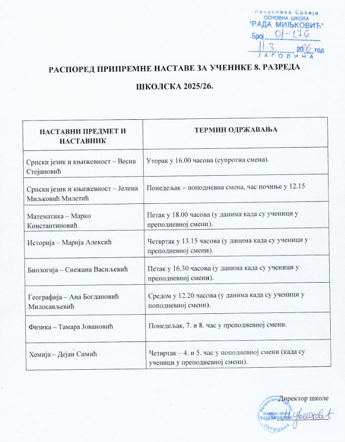 РАСПОРЕД ОДРЖАВАЊА ПРИПРЕМНЕ НАСТАВЕ 2025/2026.