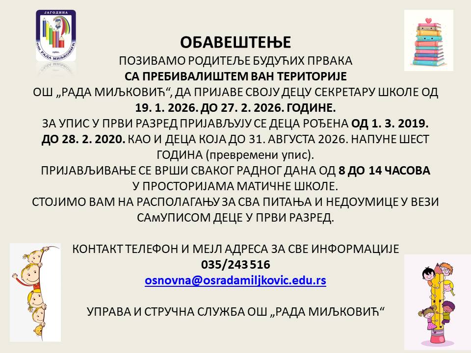 УПИС У ПРВИ РАЗРЕД - ШКОЛСКА 2026-27.